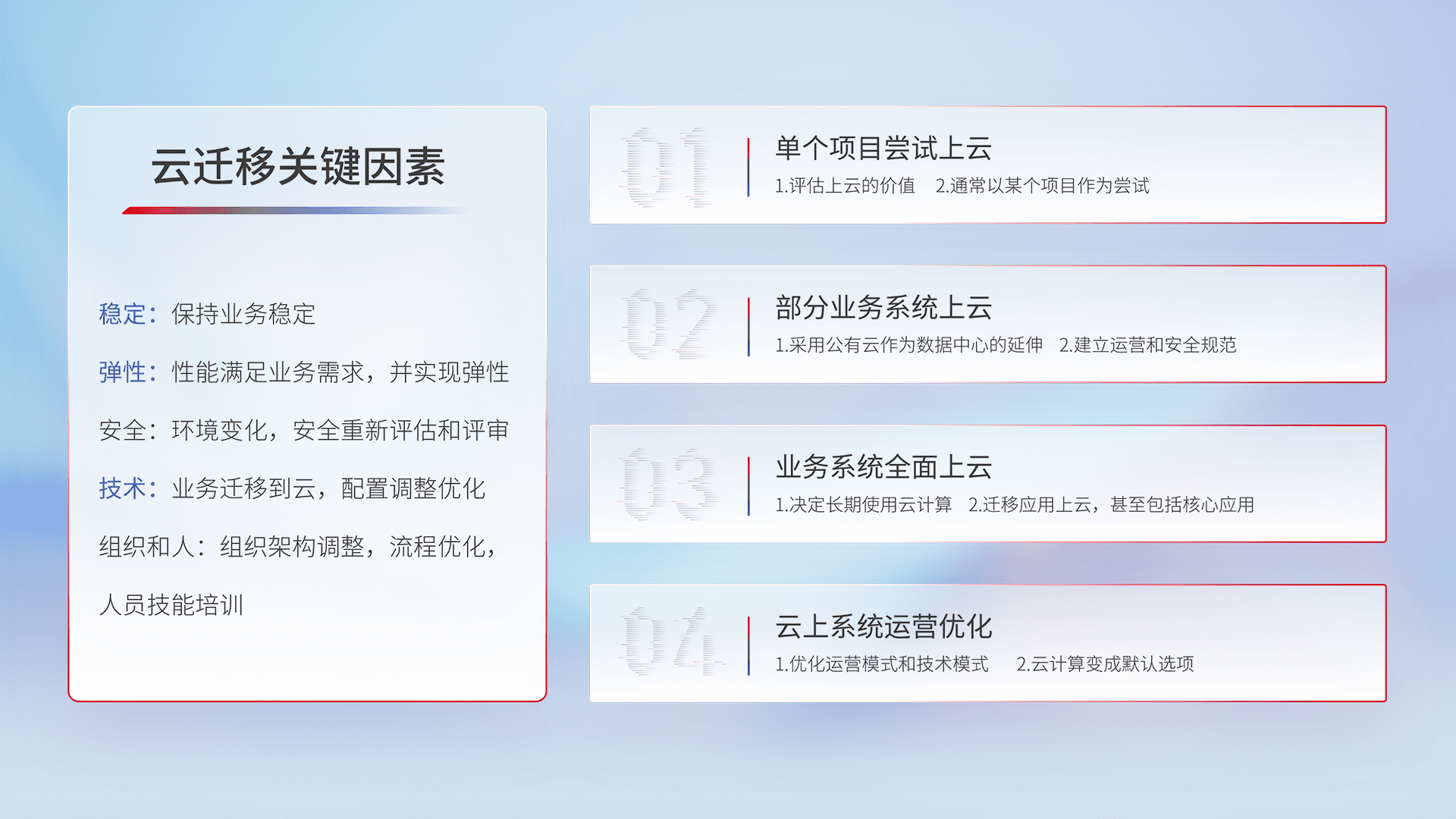 结合实际业务,,,从规划设计、、、云平台选型、、、云原生改造、、、数据迁移、、集成交付,,,迁移全过程为客户识别最佳上云路径,,,做好风险识别管理,,设计网络架构、、身份权限、、安全审计合规、、操作审计、、、日志审计、、、、监控告警策略、、、、多站点容灾设计等,,对云上基础设施进行整体规划,,,,提升IT治理水平,,,以满足弹性、、、高可用、、高性能的需求。。